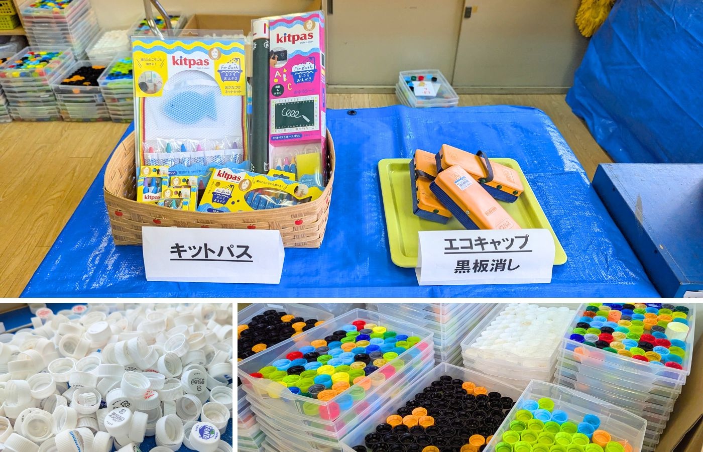 現在、パシオではボトルキャップリサイクルに加え、キットパスの持ち手に紙を巻く作業や袋詰め作業などを受託。売上は利用者の収入になります。
