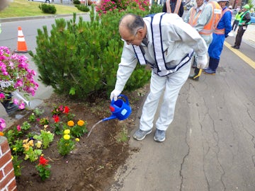 白線のライン引きで地域の安全を守りつつ、花植えなどで環境を守っています。