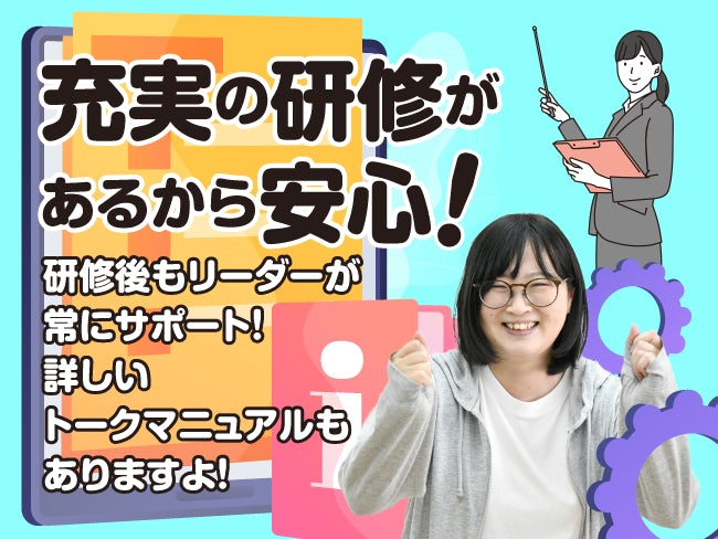 [教育・研修について] | 3カ月間の研修・OJTが必須となります。 ※研修期間は、平日週5日/9:00〜18:00勤務(休憩80分/実働7時間40分)となります。 座学から始まり、講師と実際の流れをロールプレイングで学んで頂きます。 後半は、講師が横につきながら実際に電話を取るOJTを行います。 |