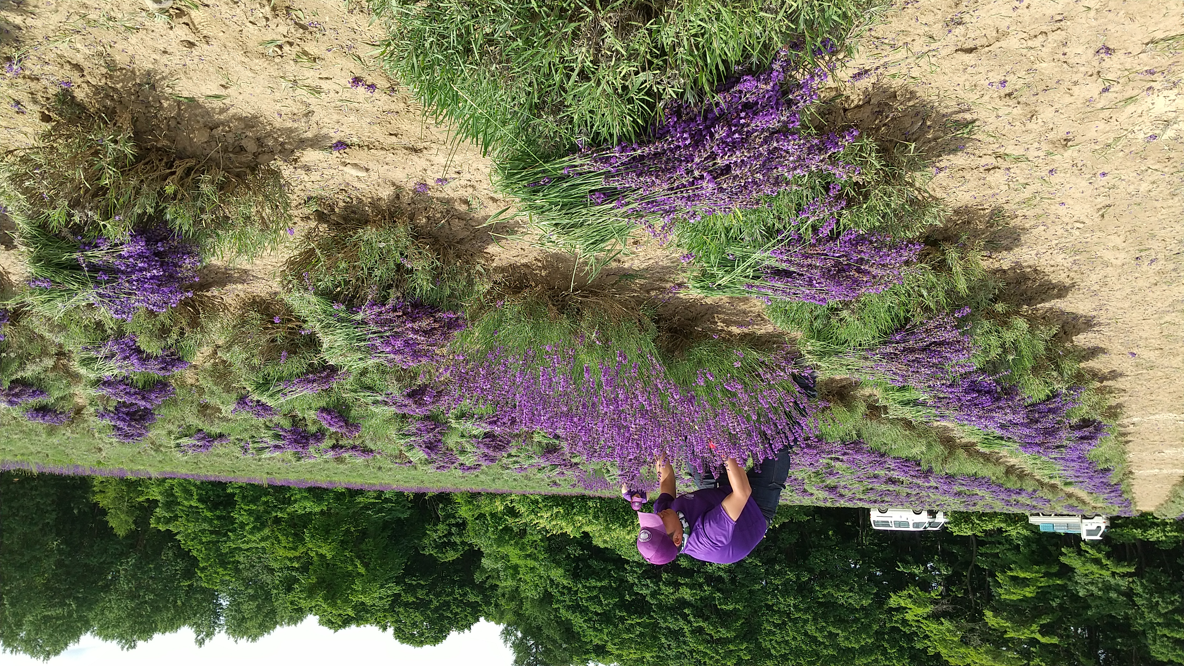 ラベンダーの手刈り作業です。朝刈り取った生花をそのまま販売したり、ドライフラワーや蒸留工場でオイルになります。