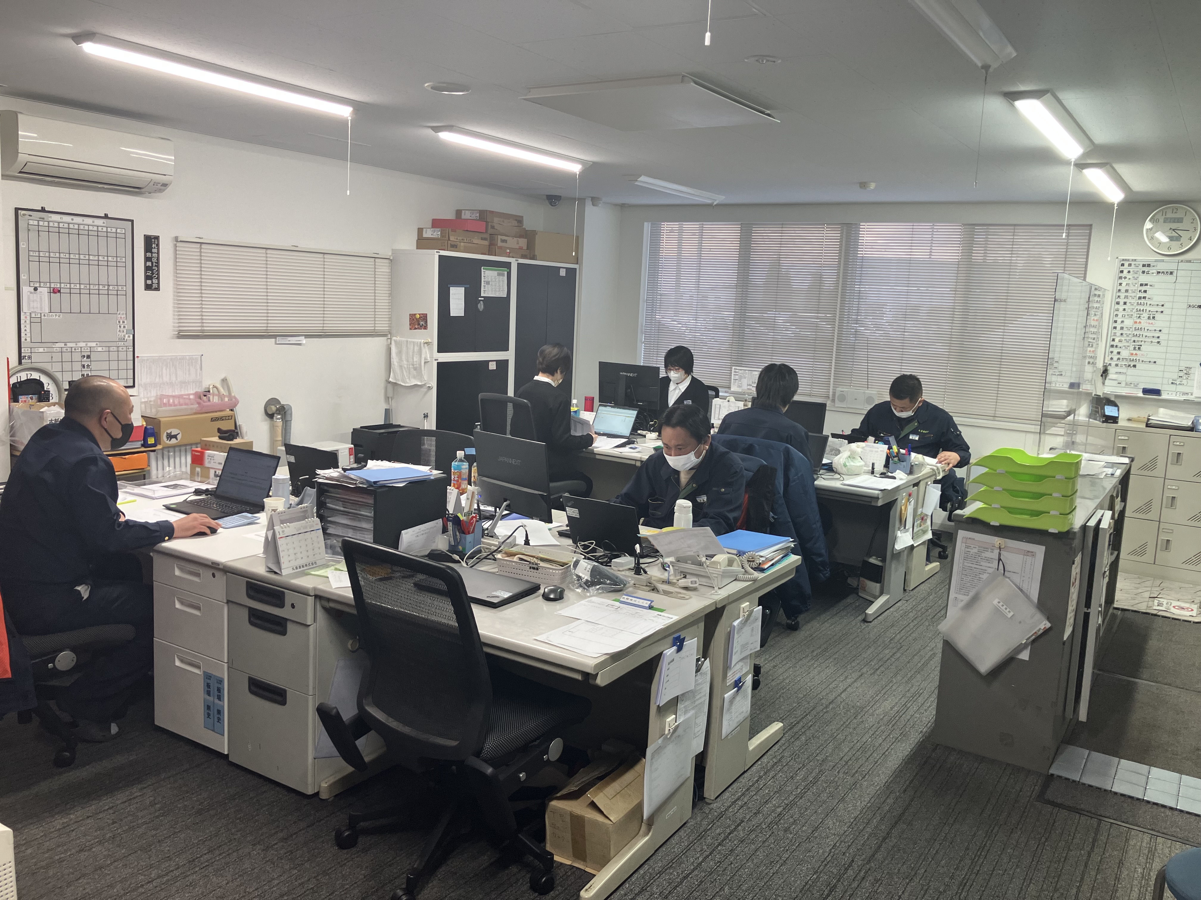 事務は2名、他に採用担当者や倉庫管理のスタッフ含めて約10名ほどが事務所内で働いています。気さくに話しやすい人が多く、新しい方もすぐに馴染めるかと思います。