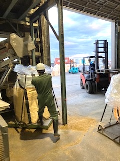 製品の移動作業の様子(一袋20kg)。シール部分の確認や形状を整える作業もあります。