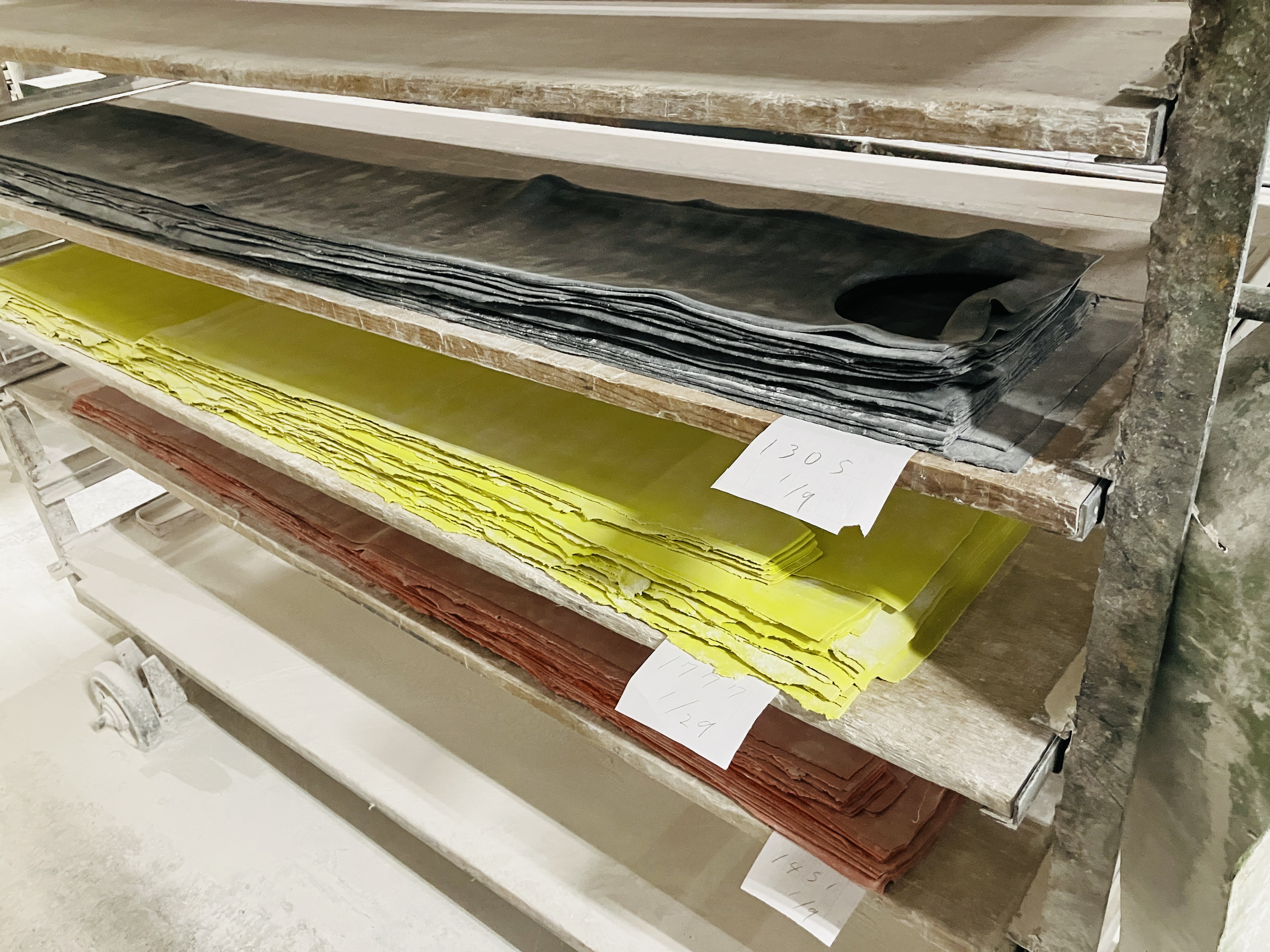こねたゴムは薄く伸ばされて1枚のシートに。まるでうどんやラーメンの生地を作る工程と似ています。白い粉も汚れではなく、打ち粉のようにゴム同士がくっつかないようにしているんですよ。