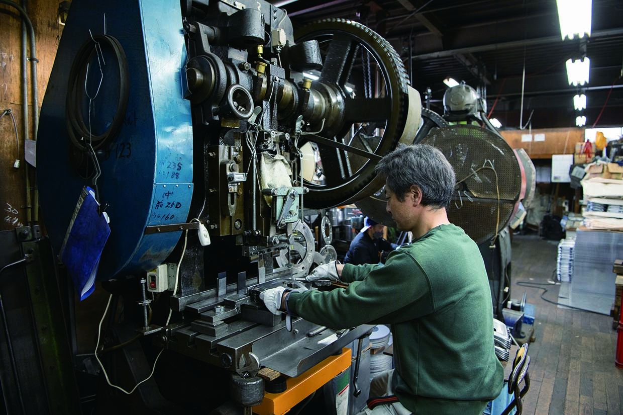 工場内で鉄板のカット・プレス・組立・ストーブの脚の取付など業務を分担して作業しています。こちらはプレス加工の様子。カットされた鉄板に模様を入れていく作業です。
