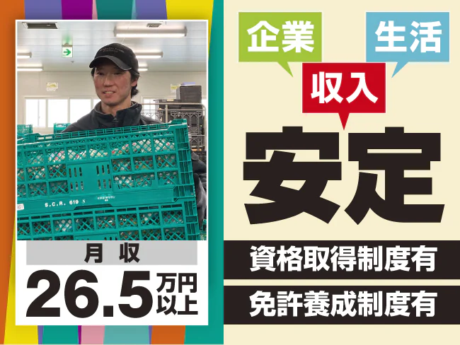 | [福利厚生] | 各種社会保険完備(雇用・労災・健康・厚生年金・介護) 車通勤可、制服貸与、安全靴貸与 資格取得制度有 免許取得制度有(全額支給/規定有) 他委細面談 |