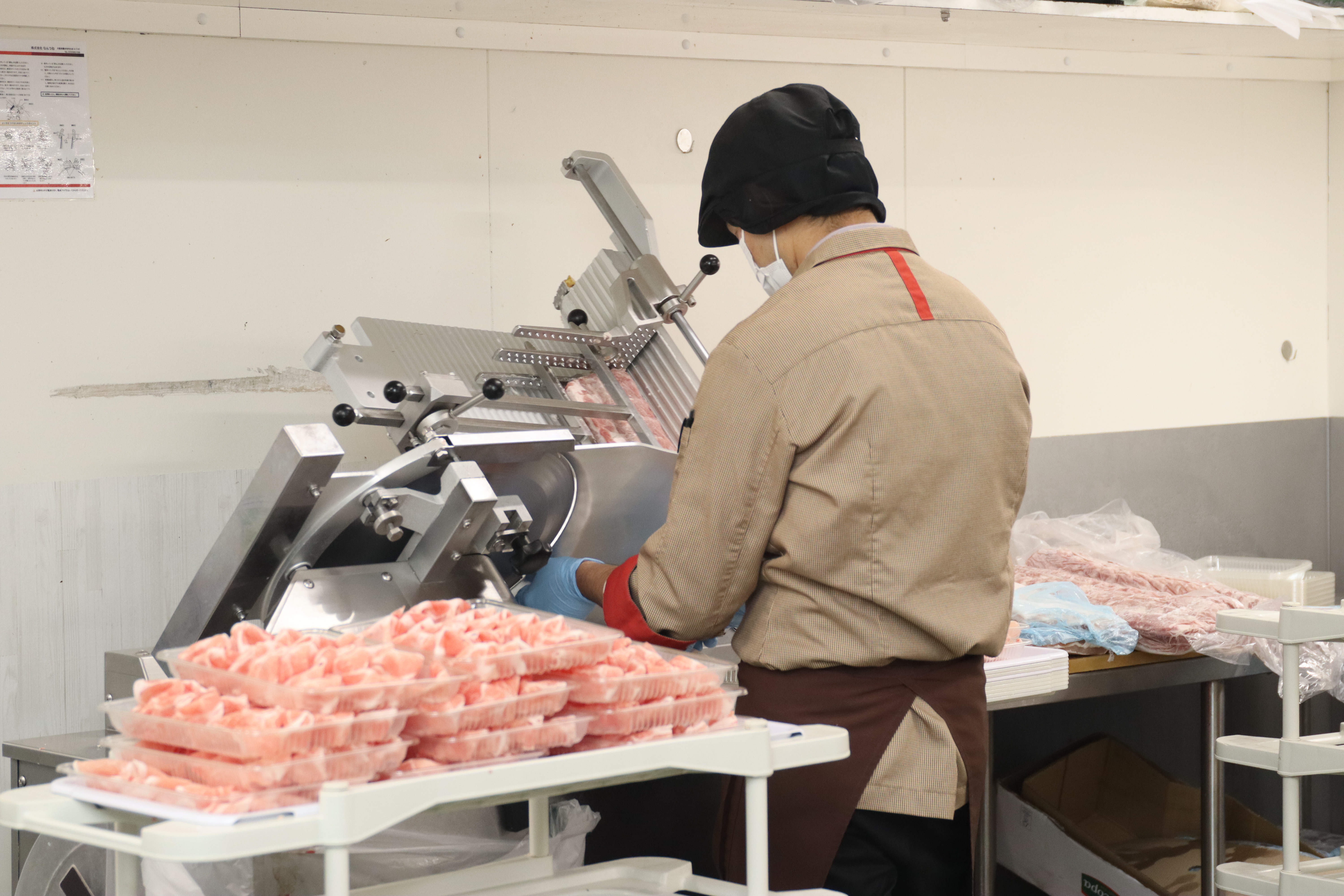機械(スライサー)を使用し切り分け作業中
