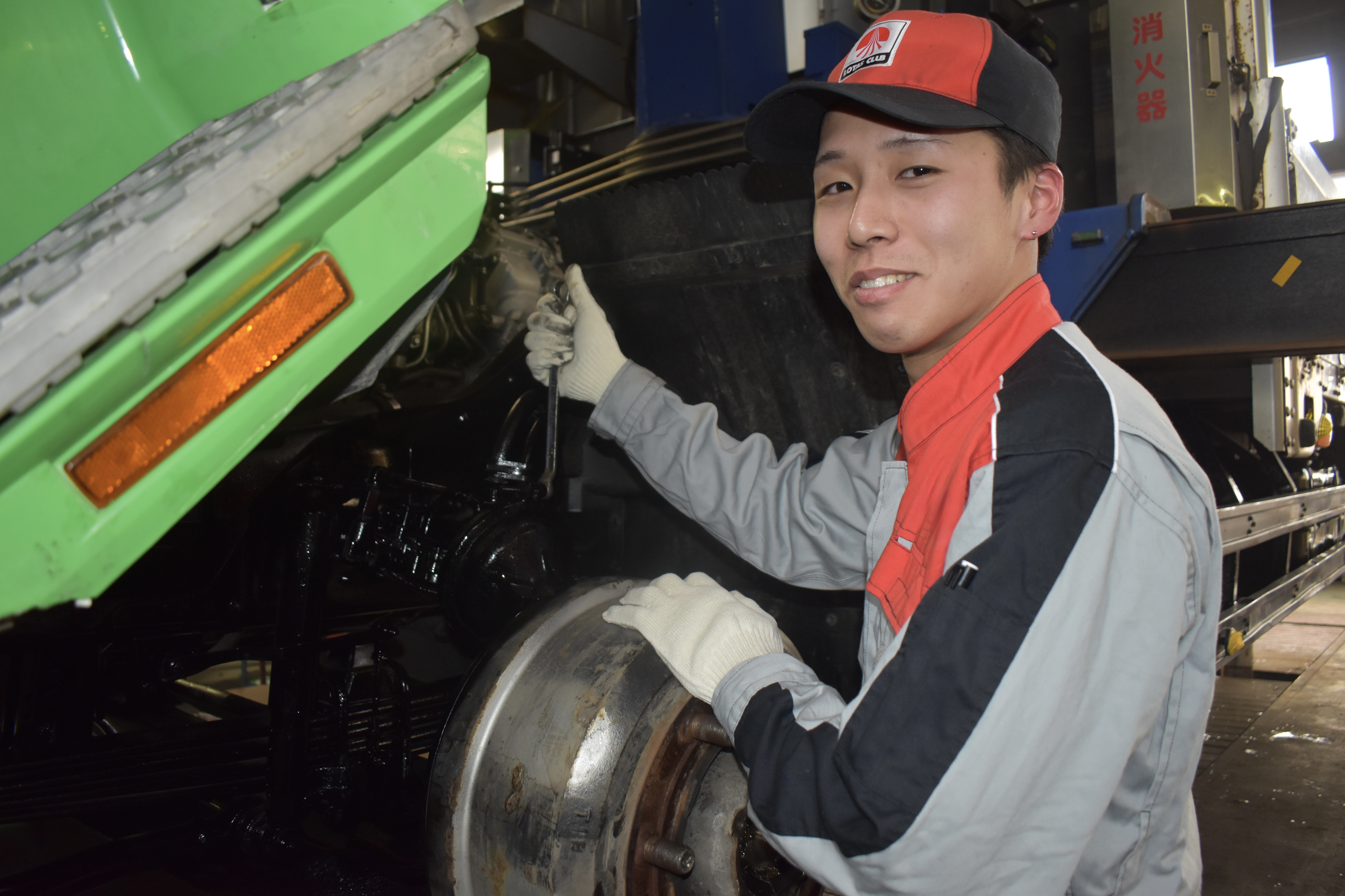 当社を選んだ決め手はトラックの整備を手掛けていたこと。というのも、整備士としてデビューするのに、大型車のほうがパーツが大きく、構造も理解しやすいのではと思ったんです。元自衛隊ですし、体を使って覚えていくのは得意なほうなので(笑)