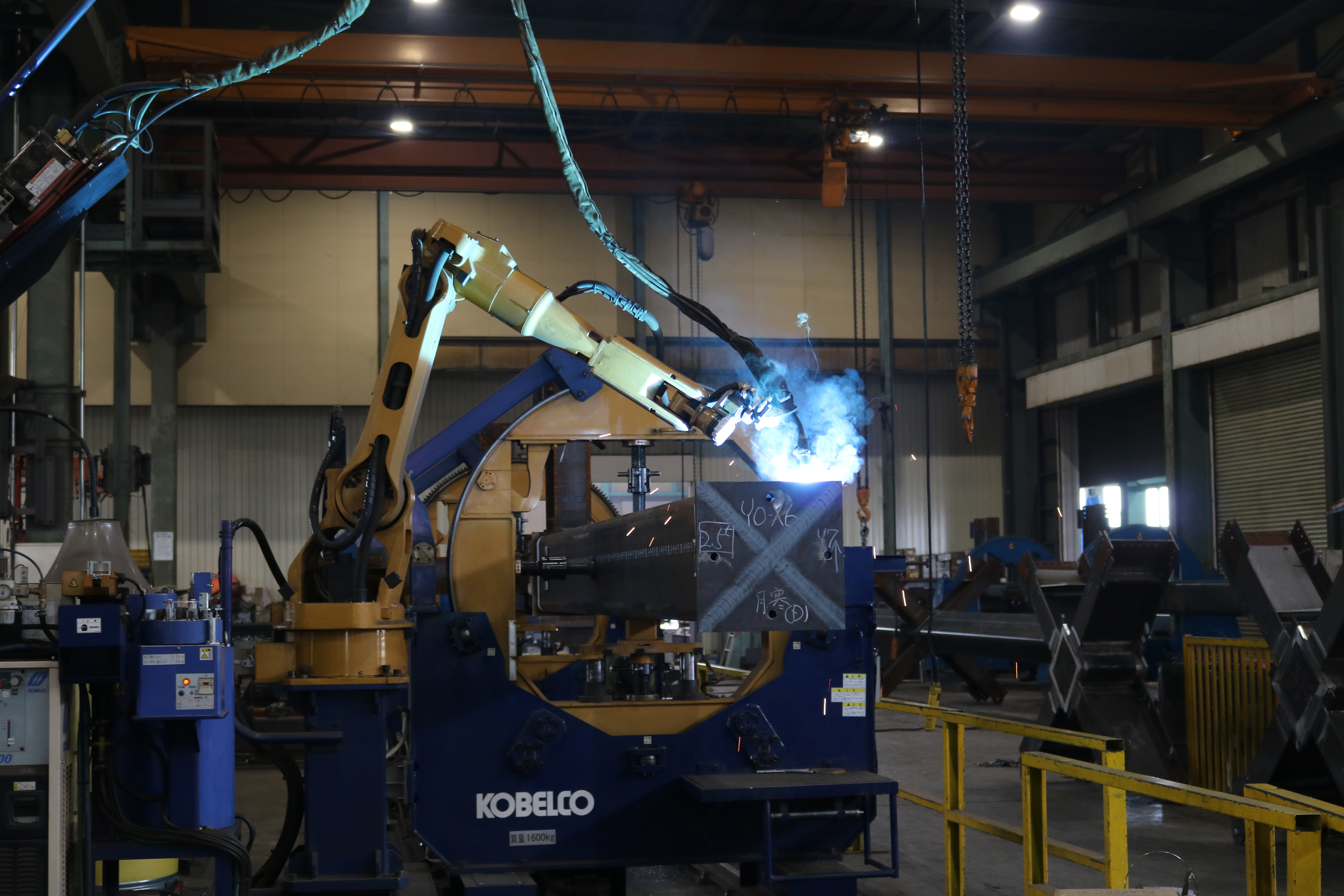 大型部材はロボット溶接で仕上げます。と言っても、細かい部分や手直しなどでは、必ず「人」の手が入ります。工場内は、作業効率を考えて材料到着から加工後の出荷まで一方通行で安全通路が確保された配置です。