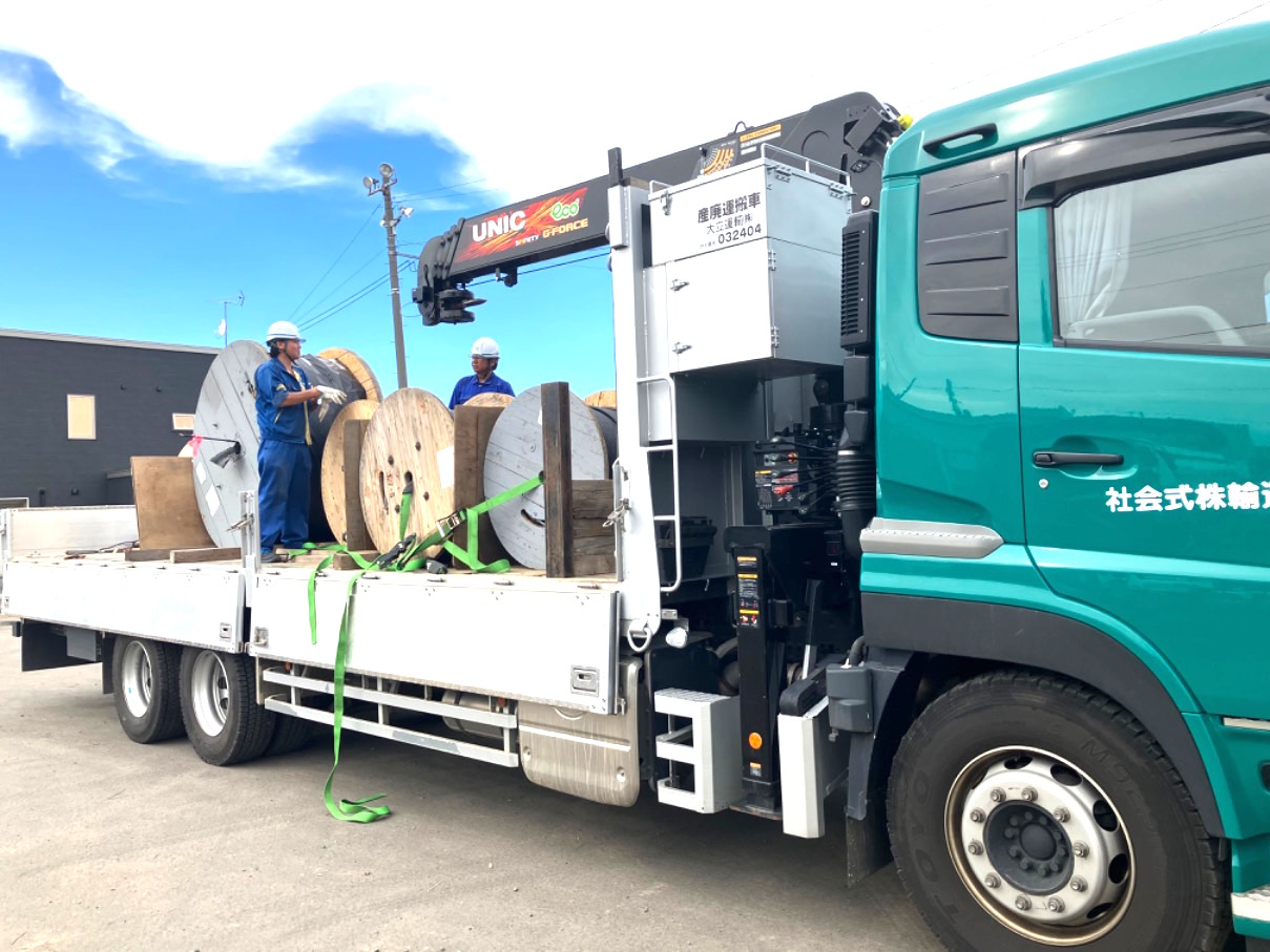 【荷積みシーン】こちらはユニック車ですが、こんなに大きなケーブルが巻かれた大きなドラム…みたことありますか??私達のライフラインを支える大切なモノです。こういったものも直接現場に届けていきます。